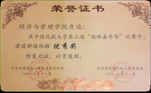 经济与管理学院团委微信公众号“经管身边”,关注人数达2470人,关注量相比去年同比增长近百分之百。公众号连续保持“中国民航大学基层团委微信公众号综合影响力排行榜”前三名,并蝉联“媒体嘉年华”评比优秀奖。