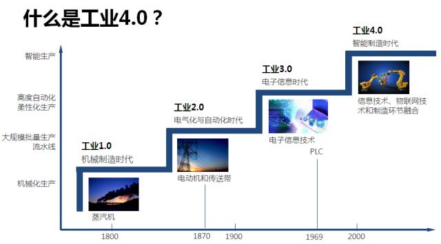 在他看来,第一次工业革命是蒸汽机;第二次工业革命是电力;第三次工业革命(工业3.0)是制造业与电子、IT的结合,推动制造业的智能化、自动化,智能制造、精准制造是工业3.0的产物。工业4.0——是信息物理系统(就是物联网)支撑下的工业第四次革命。