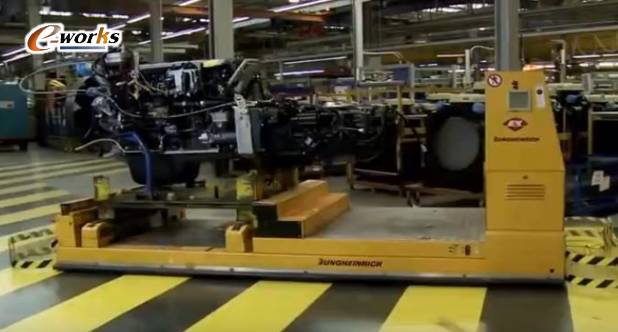 在MAN工厂我们看到,产线的规划空间利用十分充分、合理,可谓“地空”结合。在一条产线上有多种不同的产品装配过程中,AGV小车在加工线路上顺畅的流动,每一道工序都会有几名工人正在做装配螺丝等操作,各式专用工装设备运用悬挂的方式在相应的工作中心上方,架设了各种助力设备,工人随用、随取、随放,更轻松,更加宜人化。同时,空中吊装设备的设计也充分考虑到了空中运输给予装配带来的便利,也合理利用的车间空间。