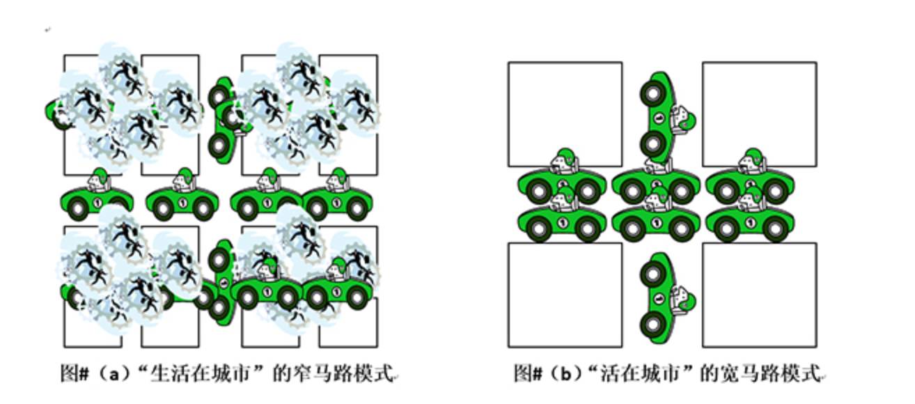 (a) “生活在城市”的图 (b) “活在城市”的窄马路模式宽马路模式