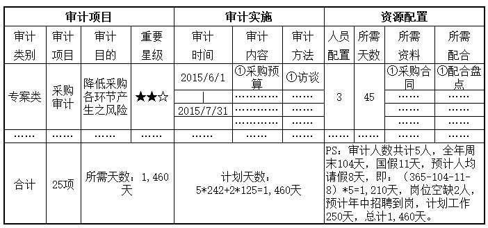 ⑤审计期间,是指计划在什么期间开展什么项目。鄙人曾认为这项可有可无,最好不设定。于是,第一年的计划没有此项目,新年第一个月,”这几十个项目,我们先做哪个?“于是七嘴八舌,面红耳赤。”这个环节我们两年都没关注了,要先实施。“”不行,这个环节出问题会很严重,要先审计。“”不对,这个项目之前高频率出了好几次异常,要先了解。“。当然,现实工作中不会这样夸张,但纠结一定会存在。于是,每个项目完成前都需要想想完成之后接着做什么。通过此次经历,次年计划纳入时间安排:一、时间间隔较长的可排前,二、风险较高的可排前,三、主要事项可排前,也可按紧急重要、重要不紧急、紧急不重要等等排列。当然有时候计划不如变化,但在没有特殊状况下则按计划实施。如此,还可以早为审计做准备。但,问题又来了,“唉,最近没状态,实在不想做专案。但接下来的专案是五星级。”于是乎,计划做了调整,合同审计换成了摄像头监控审计。“小审啊,做得不错。但是为什么没有按照计划来呢?”。如果恰逢上月有资产遗失,通过监控没有找到,那还能瞎拽个借口,但风平浪静就不好说了。其实这个场景出现的几率是比较小的,一般董事会不会关注到这些。只要在年底的时候,看计划表后面都是划勾或状态为”完成“那就OK。扯淡这么多,一句话,要不要这个项目自行评估。