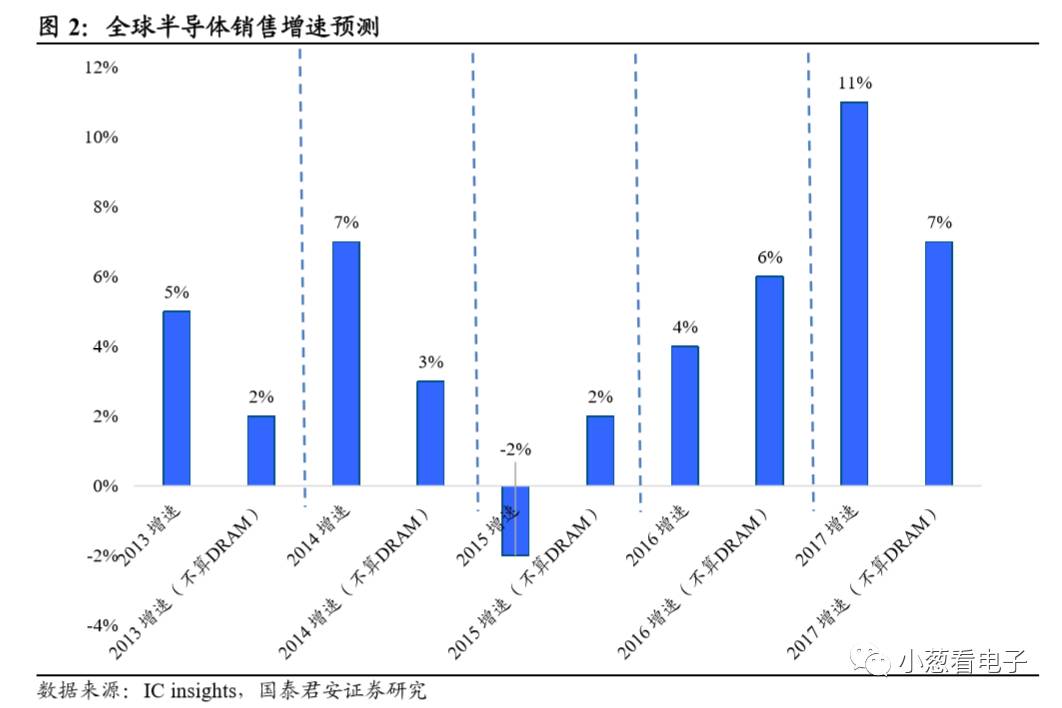 2017年以来芯片销售表现强劲,主要原因是受到内存产品如DRAM与NAND闪存的带动,但除内存产品外的半导体需求相对2016年也在不断上升。半导体市场研究机构都看好今年半导体产业表现,年成长率预测数字从温和的个位数已上调到强劲的二位数字。其中IC Insights预测,2017年全球芯片市场销售额因为DRAM与NAND的平均销售价格上扬,可望达到11%,刨除DRAM与NAND的涨价因素影响,预计仍有7%的增速。