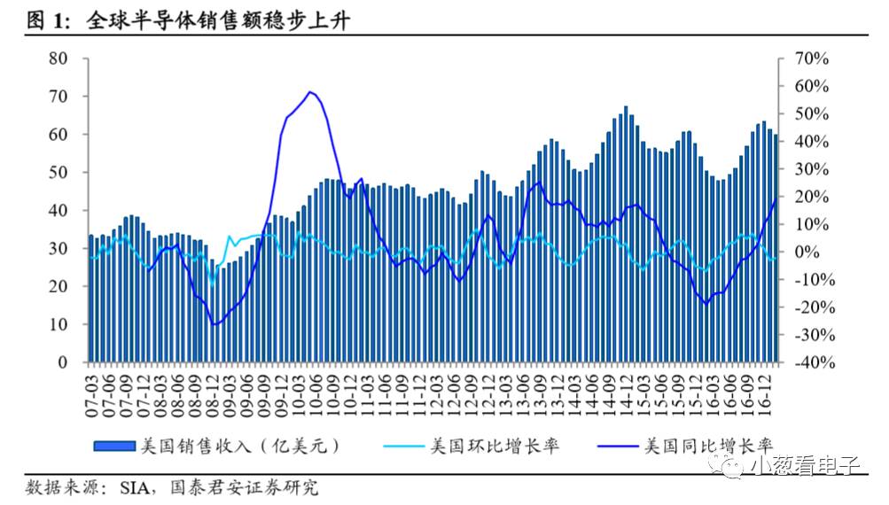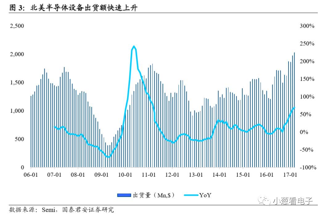 1)全球半导体回暖,设备出货/资本开支增长显示前景光明: 2017年2月份全球半导体销售额为304亿美元,同比增长16.5%,为六年来最大幅度。机构预测刨除内存涨价因素后,全球半导体2017年产值增长仍有7%。最新设备出货数据显示,2017 年 3 月北美半导体设备制造商出货金额为 20.3 亿美元,同比大幅增长69.2%,且2017-19年年全球半导体厂商总资本开始仍将保持增长,半导体市场前景光明。