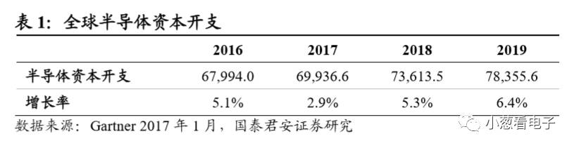 2017年3月的北美半导体设备出货数据是自 2001 年 3 月以来首次出现的强劲水准,显示半导体设备出货正受益于近期制造商的投资循环。相比2016年年初,由于更强势的定价以及智能手机市场好于预期,全球半导体厂商2017年的资本开支预计持续上升,有望达到699亿美元,增长2.9%。2018年、2019年全球半导体资本开始仍将继续上升,预计达736亿美元、784亿美元,增长5.3%、6.4%。