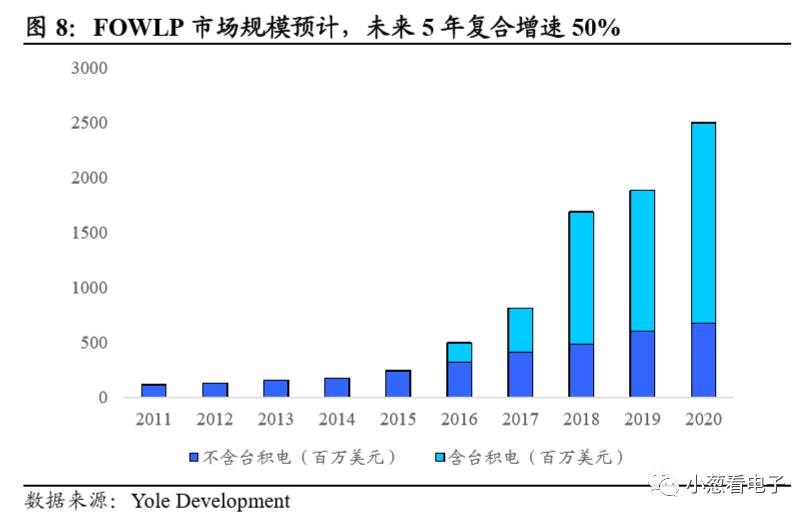 台积电在2016年依靠Fan-out封装技术拿下苹果A10芯片全部代工订单后,Fan-out技术引起了业界的巨大关注。要知道在苹果上一代A9芯片中,代工订单是由台积电和三星2家共享的。Fan-out封装技术相对传统FCBGA封装技术最大的改变在于利用RDL技术替代了基板,以此带来的进步是巨大的:1)成本下降,不用基本带来20%左右的成本下降;2)厚度下降,单块基板厚度在0.3-0.4毫米左右;3)电气性能提升,厚度减薄使内部线路的连接距离大幅缩短,因此芯片的散热及电气性能提升。Yole Development预计FOWLP市场规模将从2015年的2.44亿美元快速上升至2020年的25亿美元,复合增速为50%。