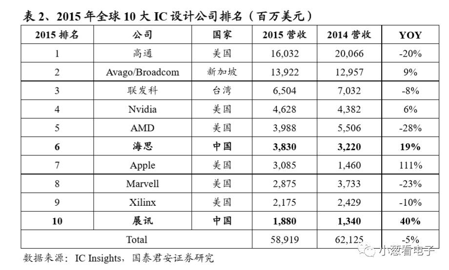 中国IC设计公司这几年来获得了长足的进步,2015年华为海思和展讯双双进入全球前十。虽然名次尚未靠前,但成长性远远好于竞争对手。2015年,华为海思总营收将同比增长19%,展讯营收同比增长40%,而高通衰退20%,联发科衰退8%。海思、展讯等中国IC设计公司面临的发展环境以及长期成长性都远好竞争对手。