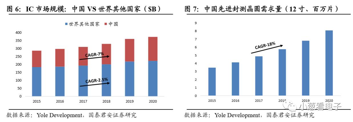 中国有全球最大的消费市场以及诸多品牌厂商和制造厂商,毫无疑问是全球最大的IC市场。未来这一状况将持续保持,且在中国经济持续增长,电子行业各环节逐渐赶超的背景下,增速将明显高于全球其他市场。研调机构预测,中国IC市场的复合年增率为7%,除中国以外的其它地区的复合年增长率为2.5%。随着中国厂商技术能力升级,对先进封测的需求剧增,预计从2015年的350万片(12寸片)增长至2020年的810万片,5年CAGR 18%,大幅超越行业增速。