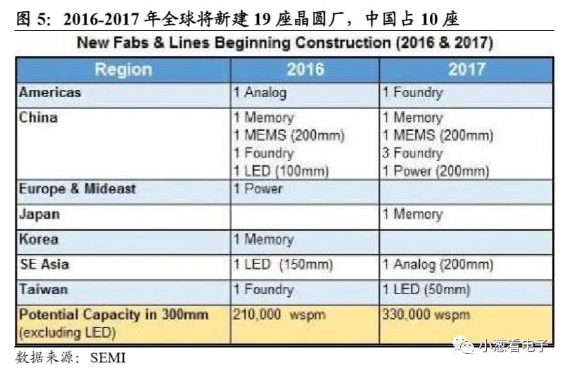 根据目前各厂商发布的信息,2016 至 2017 年间,确定新建的晶圆厂就有 19 座,其中中国大陆就占了10 座。中国是全球半导体最大市场,IC设计公司高速增长,下游需求占全球一半,因此晶圆厂设在中国是属于情理之中。晶圆厂的大力建设,一方面将惠及IC设计公司,投片更为便利,另一方面将惠及封测公司,因为需要下游封测环节配套。