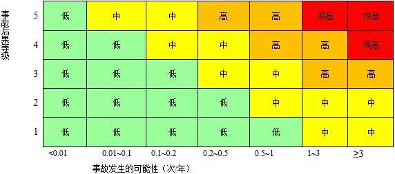 对于特定危害引起特定事故(这里“特定事故”一词既包含“类型”的含义,如碰伤、灼伤、轧入、高处坠落、触电、火灾、爆炸等;也包含“程度”的含义,如死亡、永久性部分丧失劳动能力、暂时性全部丧失劳动能力、仅需急救、轻微设备损失等)而言,无控制措施时发生的可能性较大,有减轻后果的应急措施时发生的可能性较小,有预防措施时发生的可能性最小。