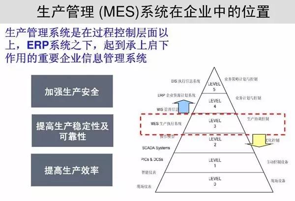 MES面向制造企业的车间层,可以为企业其它应用系统(例如ERP、SCM)提供生产现场的实时数据,从而加强计划管理层与底层控制之间的沟通。