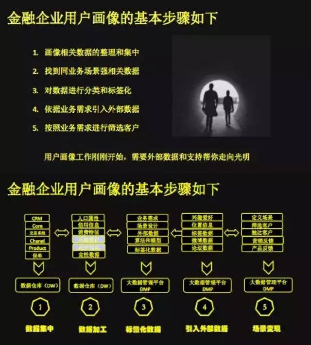 参考金融企业的数据类型和业务需求,可以将金融企业用户画像工作进行细化。基本上从数据集中到数据处理,从强相关数据到定性分类数据,从引入外部数据到依据业务场景进行筛选目标用户。