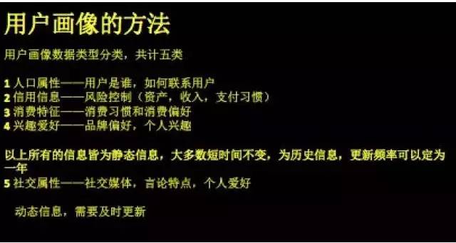 用户画像本质就是从业务角度出发对用户进行分析,了解用户需求,寻找目标客户。另外一个方面就是,金融企业利用统计的信息,开发出适合目标客户的产品。