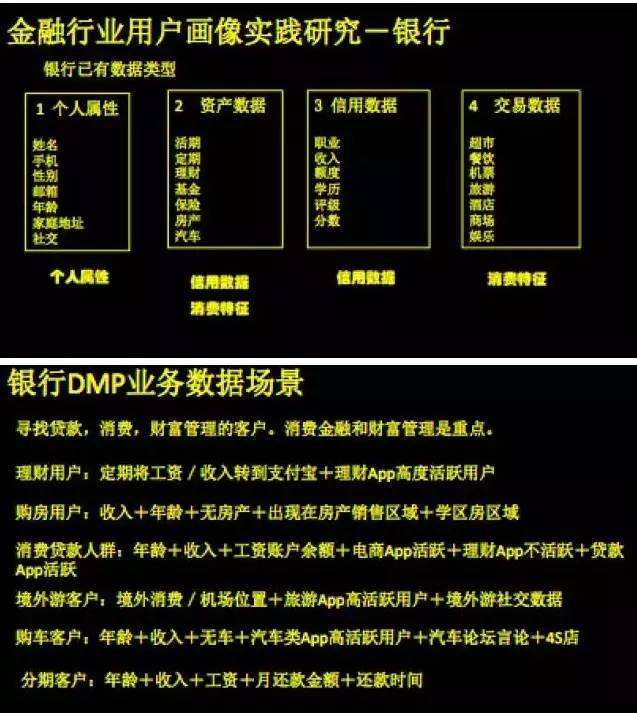 银行具有丰富的交易数据、个人属性数据、消费数据、信用数据和客户数据,用户画像的需求较大。但是缺少社交信息和兴趣爱好信息。