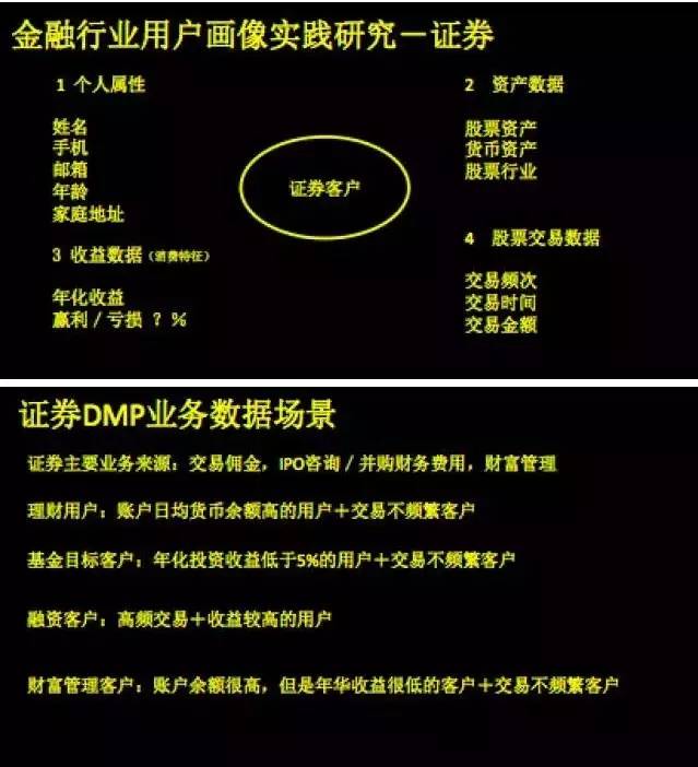 2015年4月13日,一码通实施之后,证券行业面临了互联网证券平台的强力竞争,依据TalkingData发布的金融App排行榜,移动互联网证券App,排名前5位的证券类App,只有一家传统券商华泰证券。排名第一的互联网券商同化顺覆装机量是排名第一传统券商的6倍,前三名的互联券商总体覆盖用户接近6000万用户。用户总数还在不断增加。传统证券行业现在面临的主要挑战是用户交易账户的争夺,证券行业如何增加新用户?如何留住用户?如何提高证券行业用户的活跃?如何提高单个客户的收入?是证券行业主要的业务需求。证券行业拥有的数据类型有个人属性信息例如用户名称,手机号码,家庭地址,邮件地址等。证券公司还拥有交易用户的资产和交易纪录,同时还拥有用户收益数据,利用这些数据和外部数据,证券公司可以利用数据建立业务场景,筛选目标客户,为用户提供适合的产品,同时提高单个客户收入。