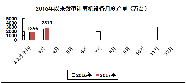计算机行业生产增速继续回升,出口形势有所好转。一季度,生产微型计算机设备6570万台,增长2.1%,其中笔记本电脑3903万台,增长10%;平板电脑1604万台,下降16%。出口交货值同比增长7.3%,其中3月份增长13.8%。