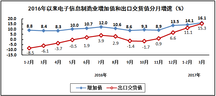生产继续加快,出口较快增长。一季度,规模以上电子信息制造业增加值同比增长14.9%,同比加快6.3个百分点;快于全部规模以上工业增速8.1个百分点,占规模以上工业增加值比重为7.3%。其中,3月份增速为16.1%。出口交货值同比增长13%(去年同期为下降6.3%)。其中,3月份出口交货值同比增长15.3%。