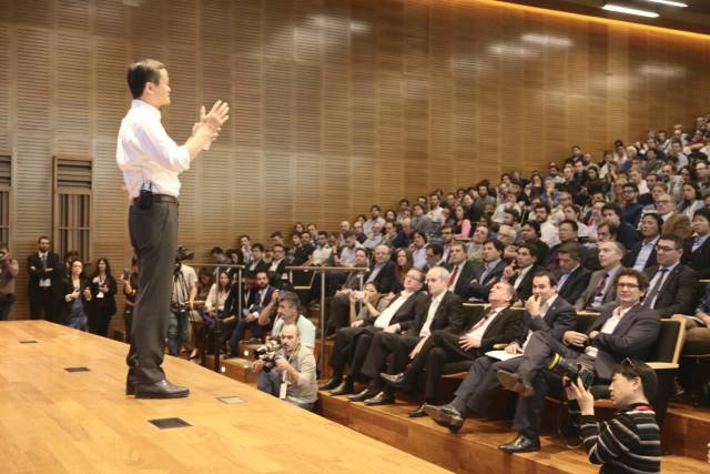 (马云台上激情演讲,听众台下全神贯注)
