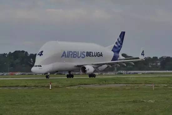 下图就是负责运送大部件的运输机,萌萌的机身,被称作空客大白鲸(BELUGA)。