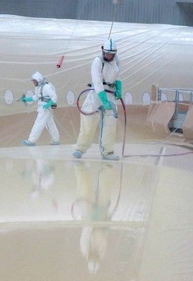 再下一步是对飞机喷漆。在图卢兹,有4个宽体飞机(A330/A350XWB/A380)的喷漆机库。其中3个在Clément Ader园区,另一个在Jean-Luc Lagardère园区。喷涂的油漆完全符合相关环保规定,采用低聚氨酯油漆和低挥发性有机物(VOC)溶剂。喷漆时采用带静电喷涂系统的喷枪,它可以使喷涂更均匀,用漆量减少,相应地可以减轻飞机的重量。