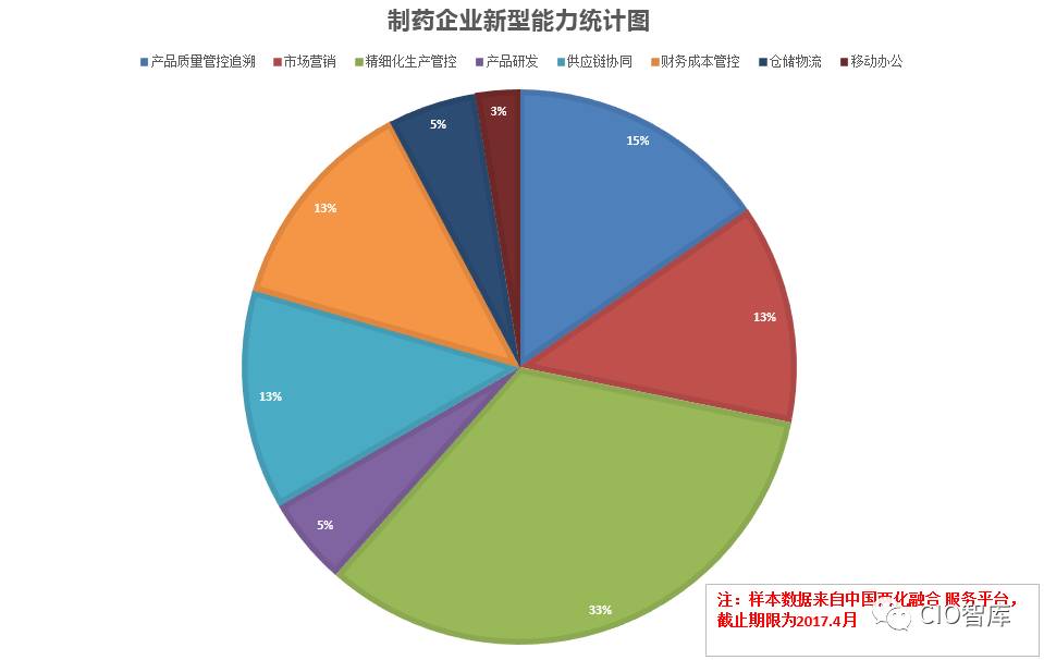 那么,作为大多数制药企业来讲,信息化建设的重点有哪些方面呢?在本篇文章中我们结合前面提到的新型能力来进行梳理,主要是对当前(截止到2017.4月)中国两化融合服务平台上已经通过两化融合资质认证的制药企业进行统计分析。当前该平台上全国通过认证的企业有714家,其中制药企业占30家。这些制药企业基本涵盖了医药行业的各个细分领域,包括化学原料药、化学药制剂、中药饮片、中药制剂、生物制药等方面,具备一定的样本代表性。这30家制药企业申请评定的新型能力数量为39个(存在一个企业申报多个新型能力的情况),对这39个新型能力样本进行统计分析,可以从两化融合建设的角度大致得出制药行业信息化建设的主要思路。