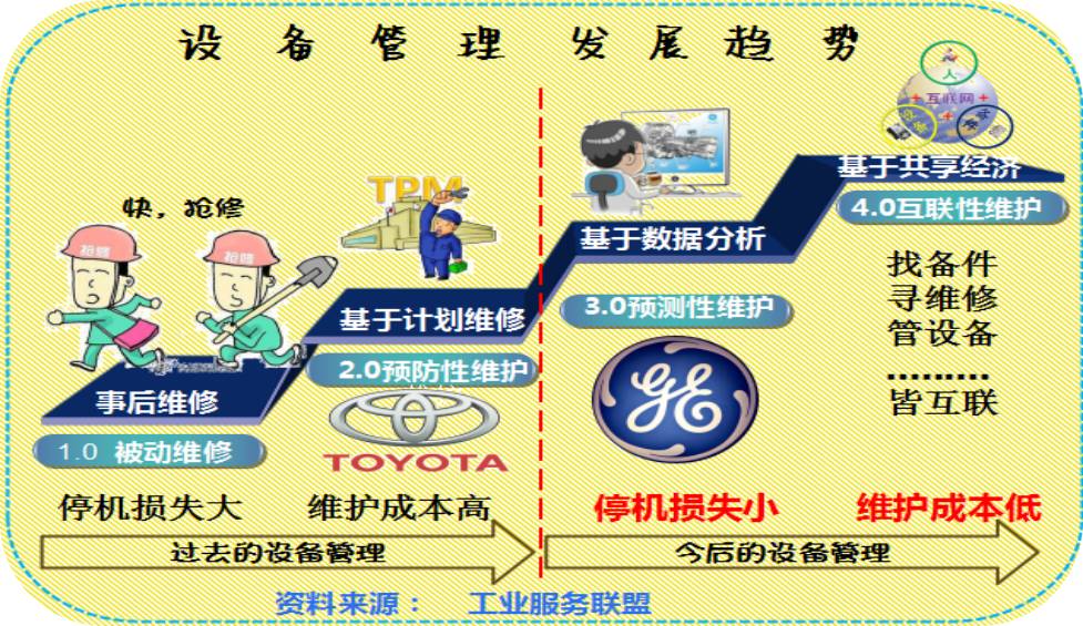 随着物联网、云计算、工业大数据的技术成熟,通过技术手段分析和预测设备故障成为可能,比如,我们可以提前一个月预测某台设备的会出现故障,那么我们只需提前一个月购买备件即可---这就是“预测性维护”(设备管理3.0)。
