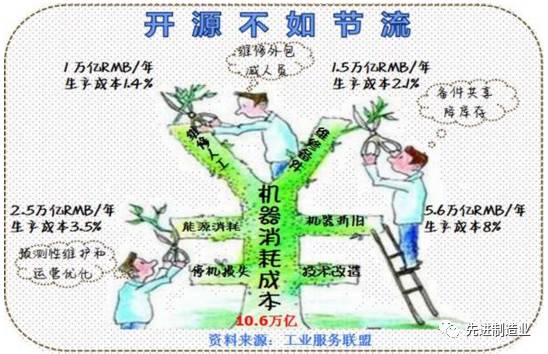 经济增长减速时代,开源不如节流,工厂成本主要发生在“人、机器、原材料”上。料的成本靠管理,比如供应链管理和丰田零库存管理;人的成本靠技术,比如机器人替代和人工智能替代;机的成本靠互联网连接,比如预测性维护和共享经济。用在“机器”这块的成本占生产经营成本的15%,放到全国来说就是10万亿,这一块成本以前没有受重视。