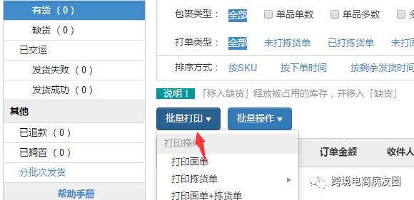 单子打好,检查无误之后,选中订单,提交发货,erp系统会自动把订单的物流单号等信息同步至店铺后台
