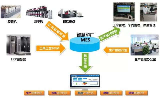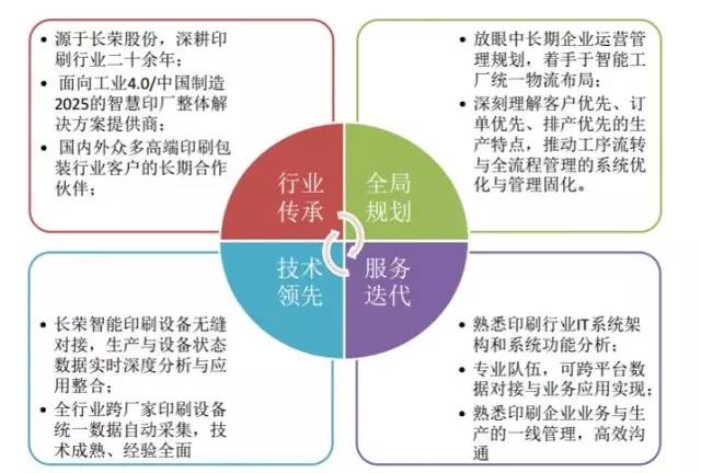 一是结合国内外先进的企业资源规划方案(ERP)、制造执行系统(MES)、高级计划排程(APS)、仓储管理系统 (WMS)、智能物流、3D仿真技术等,助力印刷企业实现订单管理全程可视、生产计划有条不紊、质量管理可控可防、物流作业自动运转、成本控制高效透明、企业管理精益掌握的现代化印厂。