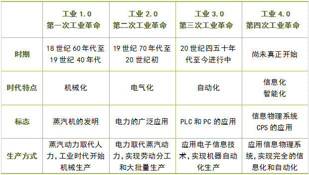 工业4.0俗称第四次工业革命,是继前三次工业革命之后的又一次生产方式变革。第三次工业革命的成果发展到今天,已经实现了完全的自动化和部分的信息化。随着大数据、云计算、人工智能等互联网技术的发展以及产能过剩日益严重,未来工厂需要实现完全的自动化和完全的信息化以满足快速、小批量、定制化生产的要求。工业4.0应运而生,其目标是智能制造和智能工厂。