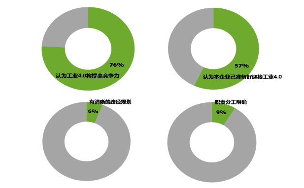 (一)中国企业的工业4.0进程中国企业的现代化进程步伐不一,一些小企业甚至还没有实现自动化生产,然而海尔、华为、徐工机械等大企业已经在探索工业4.0之路。据2016年麦肯锡的调查显示,近80%的中国企业希望拥抱工业4.0,但40%以上的企业认为自己还没有做好踏上工业4.0征程的准备,仅有6%的中国企业制定了清晰的路径规划,9%的企业做到了职责分工明确。中国工业4.0的生态系统建设、数字化运营体系建设以及中国企业的管理理念、能力和基础设施建设都尚不成熟。