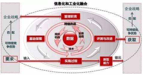 两化融合管理体系输入与企业战略相匹配的可持续竞争优势对打造信息化环境下的新型能力的要求,输出通过两化融合实施过程所形成的信息化环境下的新型能力。企业两化融合在操作层面体现为不断推进数据、技术、业务流程和组织结构四个基本要素互动创新和持续优化的过程。两化融合管理体系要求企业通过明确管理职责、夯实基础保障、规范实施过程、加强评测与改进来建立两化融合管理机制,实现两化融合的过程管理和全局优化。