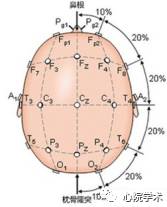 通过鼻根、枕骨隆突和左右耳前点的圆环定义为赤道。所以,把鼻根和枕骨隆突并头顶中央的连线称为经线。赤道的一半按10%和20%的比例划分。把经线按同样的标准划分,也形成了10%和20%的分界点。把经过经线分界点,并和赤道同轴平行的圆环定义为纬线。经纬线确定后,自然就得到电极的位置。
