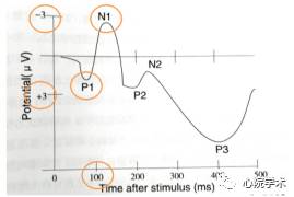 图片呈现的是一个脑电波所呈现的几个常见的脑电成分:P1、N1、P2、N2、P3。那么,常见的成分还有:N170、P300、N400等等。每个成分在不同的研究中其意义是不同的,如听觉的N400不同于视觉的N400。