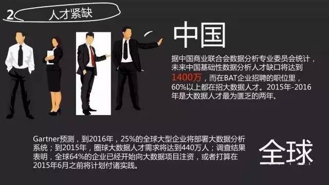 与大数据概念知名度和企业热情形成对比的是,大数据正面临全球性的人才荒。企业对新型大数据分析和预测技术人才的热情和需求正在超过传统的商业智能和信息管理人才。根据麦肯锡报告,仅仅在美国市场,2018年大数据人才(包括高级数据分析专家)缺口将高达19万。此外美国企业还需要 150 万能够提出正确问题并运用大数据分析结果的大数据相关管理人才。商业数据分析是现在全美增长最迅速的领域,据 New Vantage Partners 公司对美国《财富》500 强公司调查显示:85% 的 500 强企业已经或正在筹划推出大数据项目,未来几年这些企业在数据分析上的投资将平均上涨 36%。《哈佛商业评论》的一篇文章将数据分析称作“21世纪最热门的职业”。人力资源公司 Kforce 的调研报告预测 2014 年全球大数据相关的八大职业平均年薪将达到 11.75 万 ~14.06 万美元。中国是人才大国,但掌握和应用大数据技术的创新人才仍是稀缺资源,培养大数据相关人才成为最为紧迫的问题。在这样的形势下,对外经济贸易大学于2015 年 7 月向教育部申报开设“大数据科学与应用(目录外)”本科专业。
