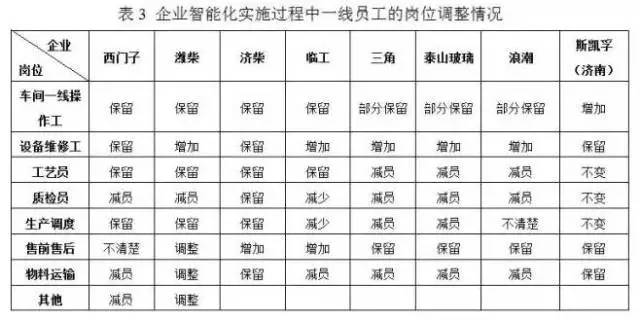 从调研的情况分析,保留车间一线操作工的企业占50%,部分保留占37%,只有瑞典斯凯孚(济南)工厂增加了一线操作工,占调研企业的12.5%。从整体情况看,智能化水平高的企业一线操作工的需求在减少,甚至出现30%以上的减员,比如,三角轮胎和泰山玻璃一线操作工的减员超过了60%,以“机”代“工”较为突出。分析其主要原因是这两个企业基本属于流程型企业,流程型企业的智能化生产特征决定着重复性工种容易被机器替代,生产流水线的操作工容易被机器人代替。