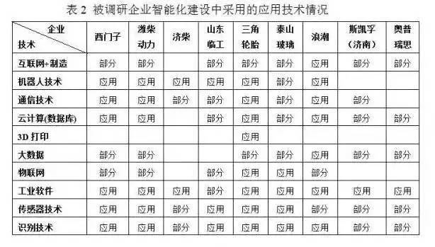 课题组在2015—2016年走访了山东省经信委、山东省两化融合促进中心2家省级信息化建设的主管部门,现场调研了德国西门子数字化成都工厂、中石油济柴、潍柴集团、浪潮集团、斯凯孚(济南)、三角集团、泰山玻璃纤维、临工集团、济南奥普瑞思智能装备有限公司、华为集团等10家企业,在每个企业都召开了由主管智能化建设的领导、人力资源部负责人、信息化主管部门人员、车间主任、技术员、一线工人等不同层次人员参加的座谈会。课题组收集了企业典型案例41个。