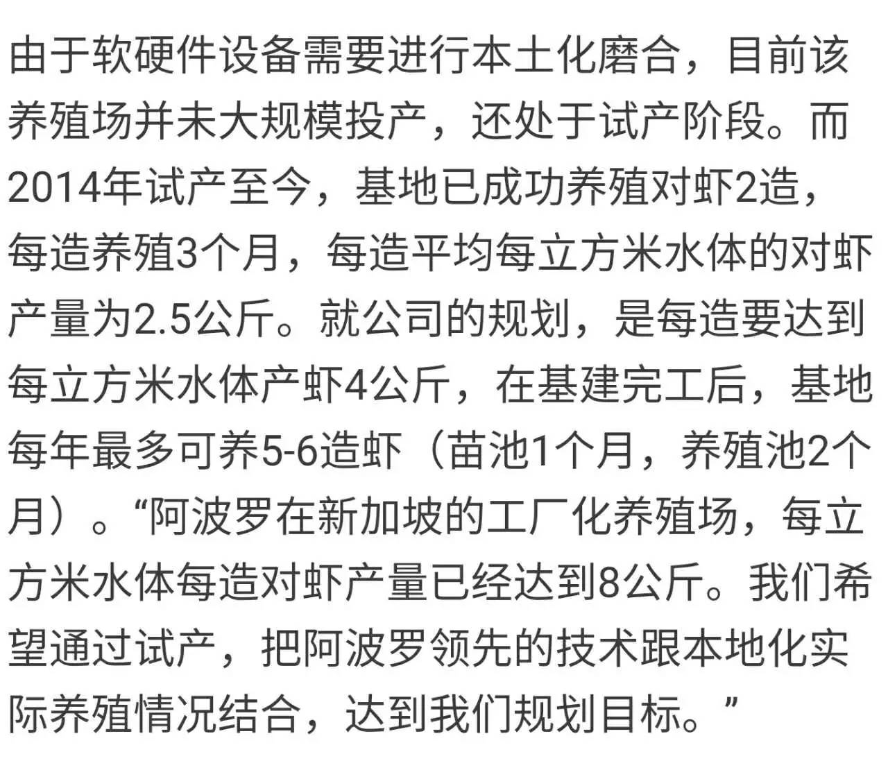 投资1.2个亿,每立方米水体每造可养成4公斤虾,最多可养5-6造,新加坡阿波罗养殖集团(以下简称“阿波罗”)在江门市斗山镇建立阿波罗(中国)养殖基地,希望用强大的数据分析平台,打造全自动的工厂化养殖基地。
