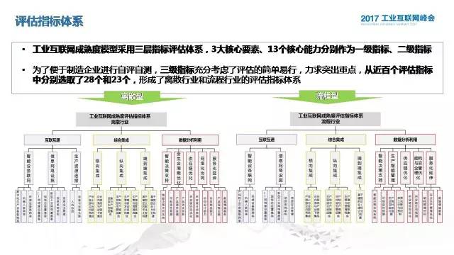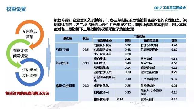 基于前面三大核心要素还有十三个关键能力,我们确定了一级指标、二级指标,在二级指标下面我们也做了仔细的梳理,当然这里面指标非常之多,我们考虑到为企业提供一个在线的可自评自测的评估工具,我们提取了二三十个指标,分别构建了离散和流程的两个评估体系。在这个权重设置的这一块,我们也是经过了三轮的修正,通过专家意见的征集还有在线评估问卷调查以及评估结果反向的调整去确立我们的权重。根据我们获得的结果,应该说各个三级指标获得的重要性是比较一致的,所以我们对于每个二级指标下的三级指标权重采取均值的处理。在评估结果反响调整我们主要是避免单一指标权重过高去影响整体结果的情况,也是基于评估结果,我们把数据分析利用这个权重降低,把国家现在工业互联网发展所处的现状决定的。