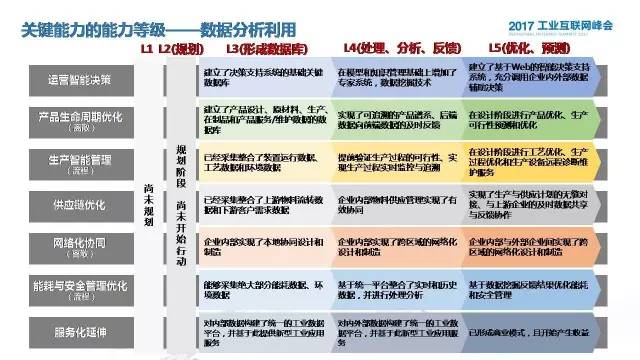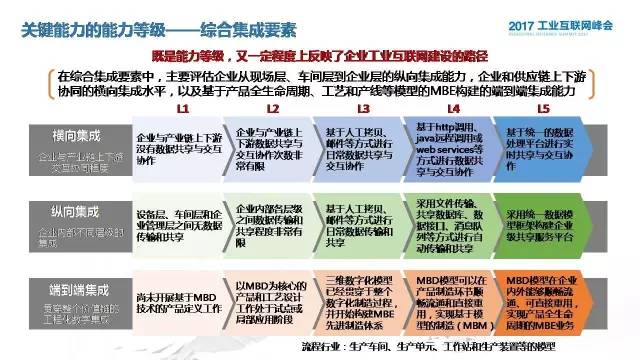 下面介绍一下白皮书1.0的内容,首先是为什么做这个成熟度评估的模型。刚才Infosys的辛格先生也已经讲了,成熟度的重要性不言而喻。我们国家的工业互联网的应用也是正在不断兴起,像2016年度里面我们也发现很多先进的案例,所以我们联盟作为一个重要的工作平台也有责任率先开展这个评估的研究。但是我们这个评估不是为了给大家创造一个复杂的理论,去指导大家用,我们只是为了去创建一个能够为企业自评自测的很便利的在线评估的工具。我们也不是为了去构建一个畅想未来二三十年我们给大家构想的工业互联网的宏伟蓝图,我们更多是想去以评估作为一个切入点,搭建一个窗口,在这个窗口里我们的应用企业可以实时呈现去反映他的现状、问题,我们的解决方案提供商也可以从这里不断输入他们对问题诊断和评估所积累的一些经验和智慧。我们这个模型主要包括三大核心要素和两类评估对象,主体的思路还是依托我们工业互联网产业联盟之前发布的《工业互联网体系架构》》1.0版本中间所提出的三大闭环的核心,第一个是面向机器设备的,面向生产运营的,也是面向企业交互、用户交互、产品服务优化的,互联户头,综合集成,数据分析利用。互联互通主要是评估人与人、人与机器、机器与机器、机器与产线、服务与服务之间的,从现场到企业不同的层级,从产品全生命周期的各个环节以及企业内部所使用的不同的系统之间的互集成、互操作的能力。第三个是数据集成应用,从前两个获取的数据进行数据分析挖掘,从而对设备、生产、服务运行优化。我们考虑了离散型和流程型两类企业的不同之处,也制定了不同的评价的指标体系,这里面面对三个核心要素下面我们梳理了三个关键的能力,主要是考虑了离散和流程这两个不同行业他们的共同点和差异点。在数据分析利用环境我们也是考虑了两类企业不同的因素,比如说话像离散型,对网络化协同,这个是他们重要的一个创新的模型,但是在流程型里面可能更多的去关注人员与安全管理的优化,不同的行业类型考虑方面设置了分别对应的13个关键能力,这里面我们采用了能力等级,也就是能力成熟度模型的思路,分别对每一个关键的能力进行分解对它的依次递进提出了五个能力等级。在智能设备联网这个里面,主要是通过对于数字化设备,它现在的数据信息采集与上传的程度设置了五个等级,从设备孤立到少数的数字化设备实现数据采集与上传一直到全部智能设备的联网这样一个发生的过程。在信息网络和设施里面也是涉及到了网络、信息、安全各方面的基础设施所建设的水平,主要是评估它的信息网络和安全的基础设施覆盖的程度,在生产资源连接里面,我们更多考虑是离散行业中的人机交互以及机器与机器之间的通信,比如人机交互方面,可能从最早的人机之间没有连接,到中间通过电脑去操作,以及通过移动终端实现远程的,最后是利用AR、VR技术去实现人与机器深度的交互。这个能力等级不仅是一个能力等级,一定程度上也反映了我们工业互联网建设的路径。在综合集成要素里面,横向集成、纵向集成和端到端的集成,这个过程中曾经有企业给我提出来,横向集成最好改成横向协作,他认为横向集成是企业与产业链上下游之间交互协同的程度,其实这个观点我也认同,但是横向集成这个概念应该说在我们产业界还是普遍被认可的,所以这里还是使用了横向集成这个名称。横向主要是评估企业与产业链上下游交互程度,交互通过邮件或者拷贝的方式进行交互,以及通过远程的调用或者是基于互联网的服务去实现这种交互协作,最后是基于统一的数据的处理平台去进行交互。纵向集成,这个可能大家都比较熟悉,衡量企业从底层的现场到企业层,这样一个从下至上的交互的程度。端到端的集成主要是衡量企业在数字化工程或者说模型化的企业构建的一个程度,从最早的三维模型的构建到最后这个模型在企业内部进行顺畅的流动以及复用,甚至到企业外部产业链上下游都可以进行顺畅的流通和交互。在数据分析利用这个环节,应该说这个一定程度上是基于底层的互联互通和中间的综合集成所实现的,所以说数据分析利用如果到了这个环节,我们可能直接到了第三个等级。我们这里面梳理了七个关键能力,有离散的也有流程的,但是这七个关键能力都遵循一个统一的思路,都是最做从数据库和知识库的建设,到我们基于这个数据库去做分析反馈,最后基于反馈的结果去做优化预测。