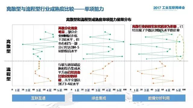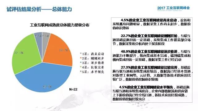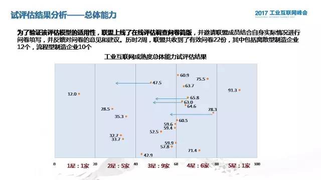 第三部分跟大家分享一下评估模型的应用和试评估的结果分析。这个评估的模型应用方法非常简单,因为我们是希望提供一个在线的评估网站,目前这个在线的评估网站正在建设当中,所以说企业基本上只是要通过这个评估问卷的入口,填写这个评估问卷,他可以实时获得一些这样的计算结果,在指标量化这块我们有定量和定性,定量主要是靠企业直接的数据去对应分值,定性,对每一个指标都进行了分解,对应不同的分值。在星级评定里面不仅是对单项能力可以评估,对综合能力也可以进行评估。综合能力评估这块,不仅效果保证他整体的分值,对每一个单项能力也设定了一个最低分,也就是说不能有偏科的行为。再下面,这个是我们在1月份的时候进行了为期两周的试评估测试,这里面是我们所获得的评估结果,总共获得22个有效样本。通过对最后结果的分析,大家可以看到它的分布,很有意思的是这里面有四个企业遭遇了降级的处理,而且都是离散型企业,离散型企业偏科的现象比较明显。从单项能力这块,在互联互通这个环节,有不同企业的成熟度水平是相对比较接近的,这里的不同企业是指参与我们调研评估的企业,整体而言,他们应该是对于工业互联网了解程度还是比较多的一些企业,对综合集成这块,成熟度水平分布比较平均,大部分是在二星和四星的水平,在数据分析这块,水平差异度比较大。离散型和流程型的区别还是比较明显的,流程型是蓝色的线条,60%都是集中在三星,就是逐步推进的阶段,很多流程型企业基础比较好,但是对于在工业互联网后期的先进技术的应用和探索方面可能比离散型相对要滞后一点,离散型呈现出比较分化的局面。从单项能力上,大家可以看得更加明显,流程和离散,他们在互联互通和综合集成方面有明显的差异,在数据分析和利用这一块,离散型企业的探索更为积极,而且也出现了少数已经达到领先水平的企业。