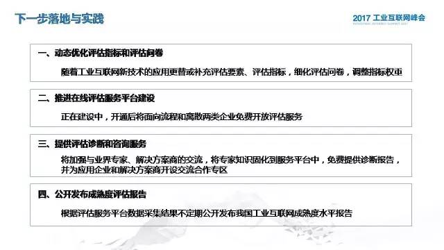前面应该说我们在互联网成熟度评估这一块做的工作还仅仅只是万里长征的第一步,下面还有很多工作要去做。我们在2017年注重做四个方面的事情。第一是动优化评估指标和评估问卷,因为前期的时候为了很快速去获得大家对于试评估验证的结果,所以我们问卷设置很简单,在后期我们要不断细化这个评估结果,可能还会一定调整我们指标的权重。第二是推进在线评估服务平台建设,这个平台是正在建设当中,希望能在年中或者第三季度开放给大家,免费给大家提供这种在线评估的服务。第三个是提供评估的诊断和咨询服务,刚刚我们产业组张总提到的,我们后续希望针对大家反映的问题,将问题诊断的力量和经验固化到服务平台中,也给企业免费提供这种评估报告。第四个会基于我们所采取的一些结构,去不定期公布我们的成熟度水平的报告。