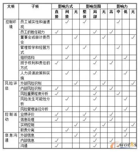 对照上述的分析,我们可以得出一个ERP在企业内部控制体系中所起作用大小的影响表如下。其中,影响方式指ERP对内部控制系统的帮助是直接的、由其自身特点带来的,还是间接的、由于使用ERP改善管理与环境带来的;影响范围指的是ERP在该领域带来的影响是针对企业全局的,还是限于企业内部部分人员与机构的;影响力则指是否应用ERP系统,对该控制的领域所造成的变化。