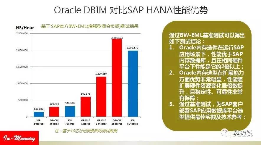在前期一次SAP和HANA的性能测试对比中,基于10亿行的记录读取,在相同硬件配置下,Oracle In-memory性能相对于SAP HANA数据库,性能非常明显,优于HANA数据库2倍以上。More