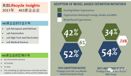 MBD由航空发展起来,并在航空业得到广泛传播,并且快速的波及的其它制造行业。美国的一家咨询机构,LifecycleInsights在2017年对463家企业做了一个调查,这463家企业分别来自于:32%来自航空和国防,24%来自汽车,22%来自高新技术和电子,还有20%来自医疗行业。通过调查发现,2014年大概6%的企业采用了MBD技术,而到2017年约24%的企业采用MBD技术,并且还有大部分企业也准备采用MBD技术。