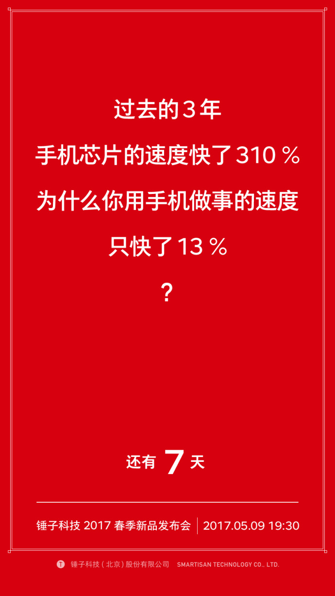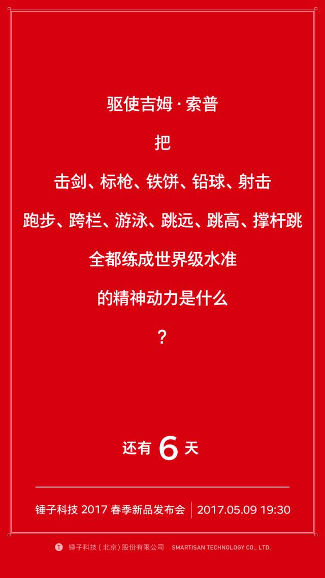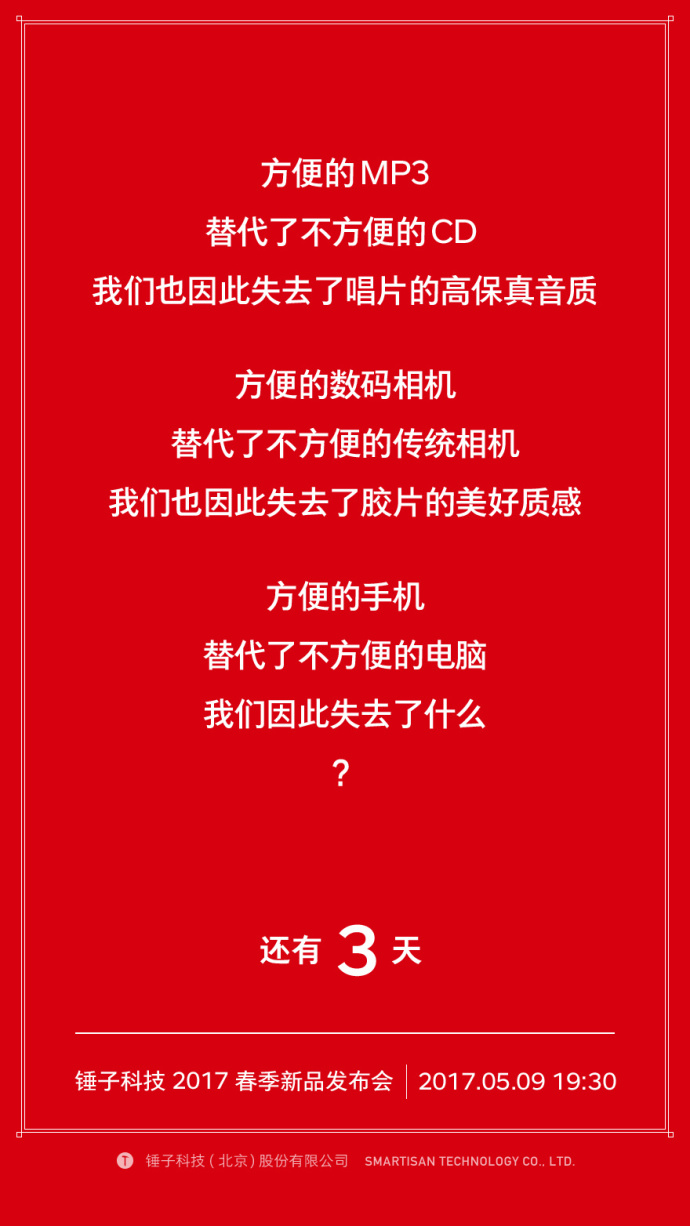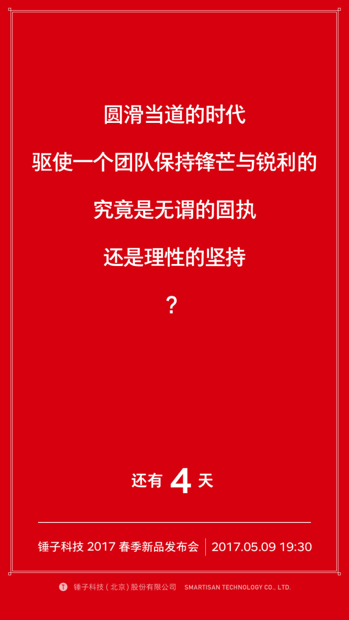 看到这里,估计大家的脑细胞已经不够用了。话说,今天晚上就是锤子新机的发布会了,作为一个非锤子粉儿,比起新机有哪些技术突破和新的功能体验,m-cases更关心锤子的倒计时海报和文案: