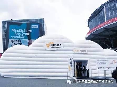 美国互联网企业亚马逊(Amazon)别具一格,不把展厅放在展馆,而是在户外搭起了一朵白色的气垫云,形象地展示自己作为云平台基础设施提供商的身份。