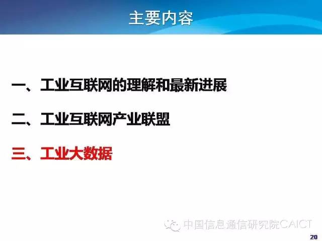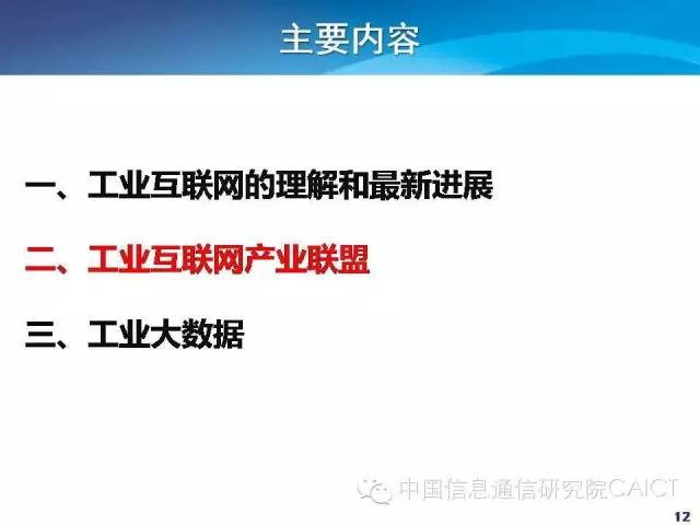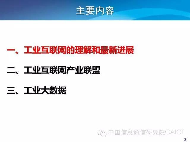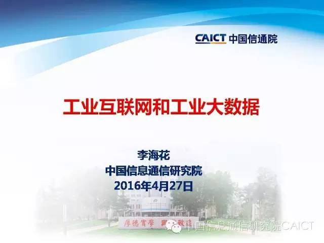 从三个方面进行介绍,一是工业互联网的理解和最新的进展。二是工业互联网产业联盟。2月1号工业互联网产业联盟成立,4月7号召开开工作组会议,想把情况跟大家分享。三是对工业大数据的认识。