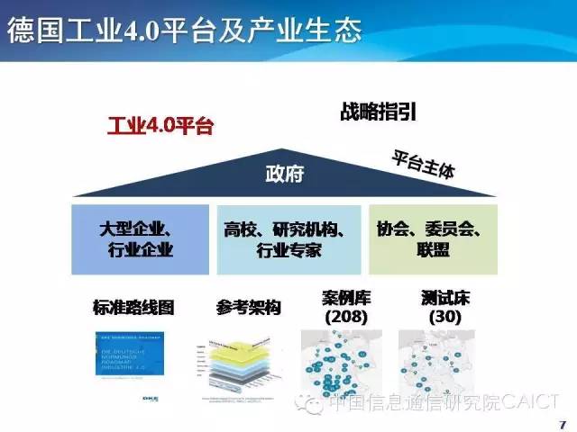 分享工业互联网的一些进展。德国工业4.0推动的比较快,工业4.0平台政府发挥重要的作用,另外企业、高校、研究机构,几大协会等,共同推动工业互联网的发展。2015年10月份发布标准路线图2.0版,提出成立工业4.0标准化理事会,发布了参考架构和详细描述,还包括案例库的收集和测试床。