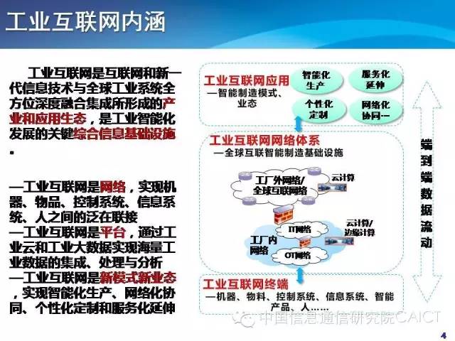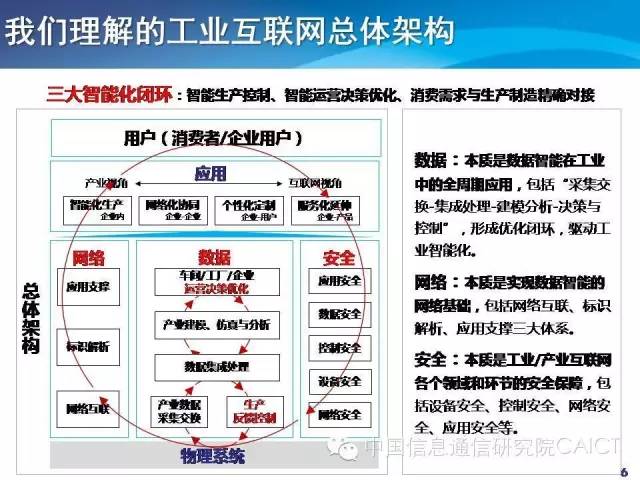 互联网是全球互联的基础设施,工业互联网架构在现有的公众网络上,针对工业有增强和演进。所以信息基础设施是很重要的一环。在网络层面,除了大网还要考虑工厂内部网络信息化和信息控制系统的发展建设。