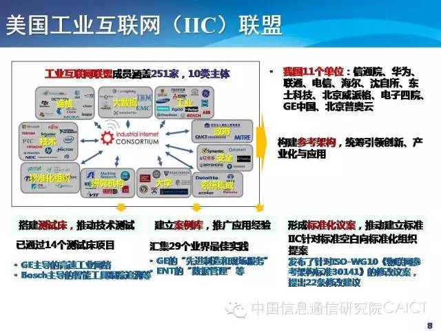 美国工业互联网联盟组织目前进展非常快,成员涵盖251家,涵盖了十大类型,有大数据企业,工业企业,系统集成企业等。40%多是美国,但德国、亚太的企业也在纷纷加入IIC,发展非常快。美国工业互联网联盟的目标是提出参考架构,在此基础上引领标准的制定和相关的研发。中国已经有11个单位加入和组织活动。美国工业互联网联盟组织梳理的核心工作,一个是测试床,进展非常快,待通过的20多个,已经通过的15个左右。另外也征集了很多的案例,提炼共性的需求,展示业界具体的经验。IIC已经和70来个组织建立了关系,希望能够深化标准组织的影响力,把IIC的成果反映到标准组织里面去,开展标准化的工作。